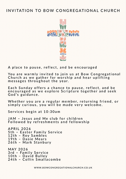 Bow Congregational Church exists to encourage people into a personal relationship with the Lord Jesus Christ. We want to incorporate people into a local church family to enable them to express their love for God and develop a deeper knowledge and understanding of Him and to equip people to love and serve one another.